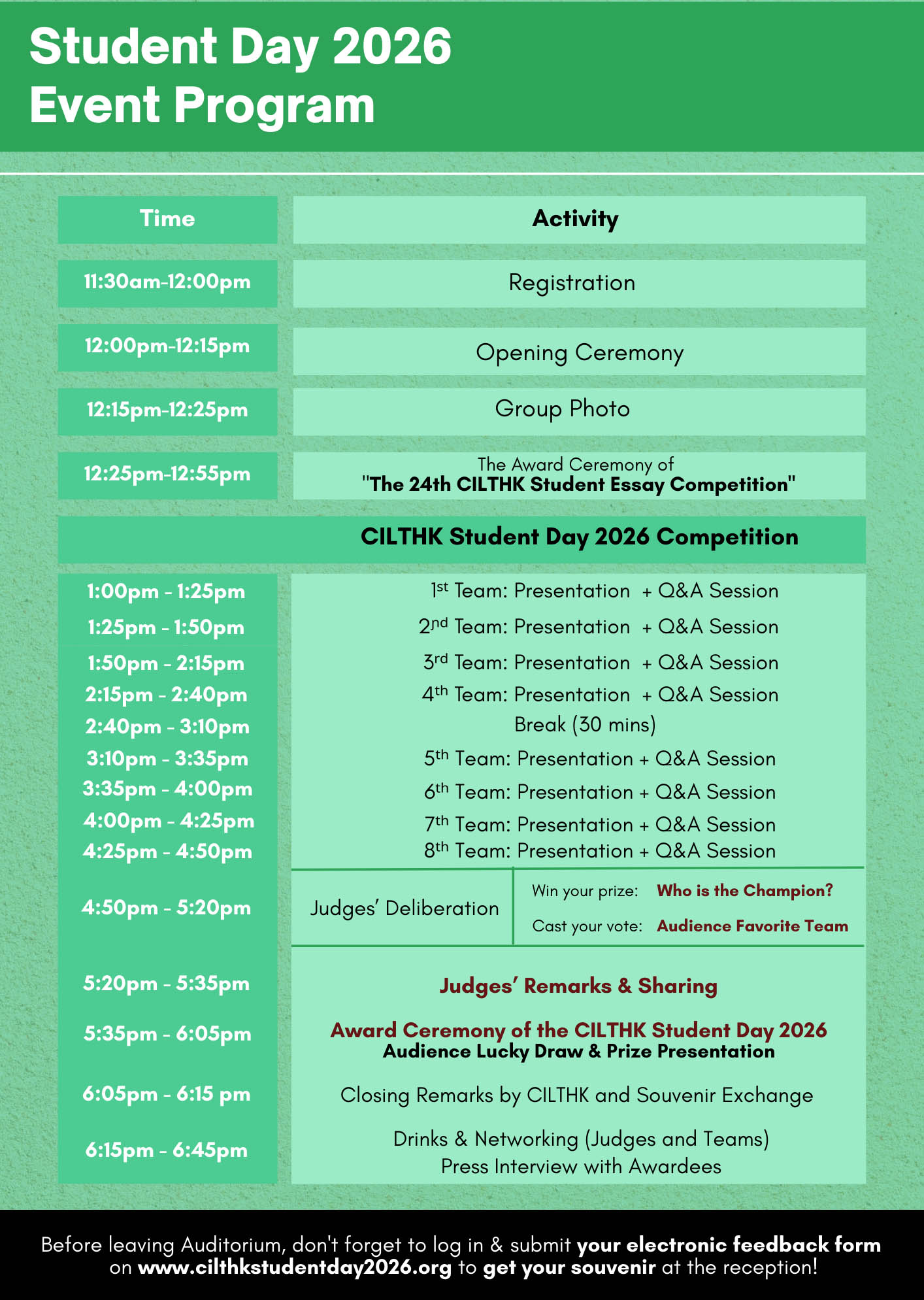 Our event program provides contestants a valuable opportunity to engage in the meaningful CILTHK Student Day on Smart Logistics 4.0 Technologies. It features research presentations to a professional judging panel, live Q&A, awards ceremony, and audience games. This dynamic format promotes innovation, industry networking, and champion recognition.